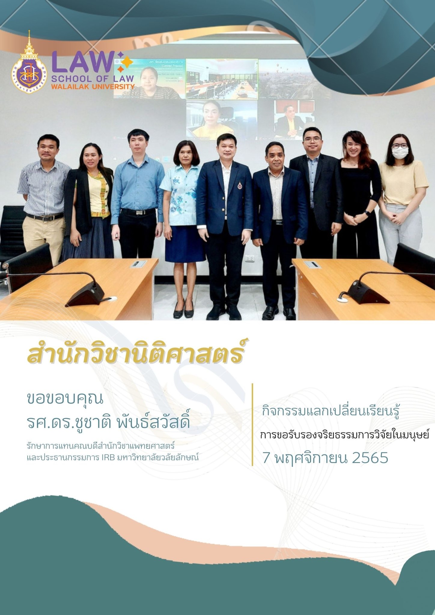 เมื่อวันที่ 7 พฤศจิกายน 2565 สำนักวิชานิติศาสตร์ได้รับเกียรติจาก รศ.ดร.ชูชาติ พันธ์สวัสดิ์ รักษาการแทนคณบดีสำนักวิชาแพทยศาสตร์ และประธานกรรมการ IRB มหาวิทยาลัยวลัยลักษณ์ มาบรรยายและร่วมแลกเปลี่ยนการขอรับรองจริยธรรมการวิจัยในมนุษย์กับผู้บริหารและคณาจารย์สำนักวิชานิติศาสตร์ โดยมีคณาจารย์สำนักวิชานิติศาสตร์เข้าร่วมฟังบรรยายและร่วมแลกเปลี่ยนทั้งonsite และผ่านระบบonline