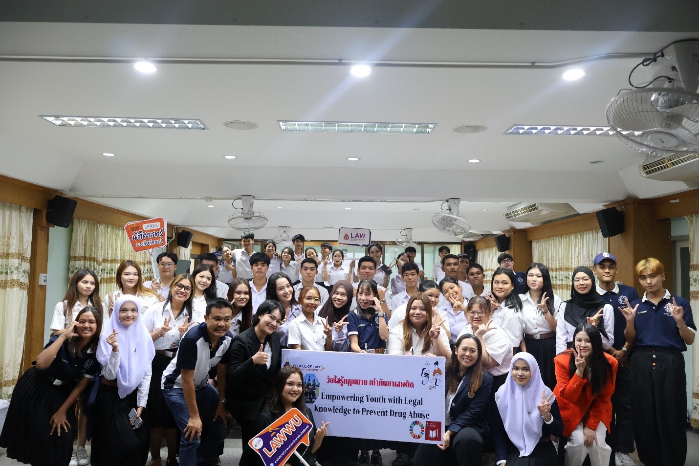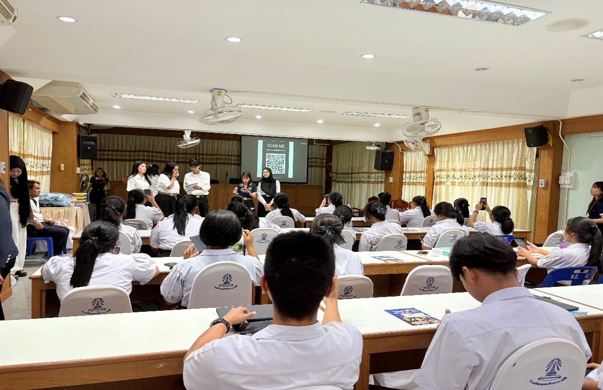 นักศึกษาในรายวิชา LAW67 – 231 Criminal Law: Offences and Petty Crimes กฎหมายอาญา : ภาคความผิดและภาคลหุโทษ ได้นำเอาองค์ความรู้ที่ได้ทำ workshop ใน Campaign “ที่ใดมีชุมชนที่นั่นมีกฎหมาย” โดยล้อมาจากวลีดังของชาวนิติศาสตร์ “ที่ใดมีสังคมที่นั่นย่อมมีกฎหมาย” โดยบรรจุความรู้ที่นักศึกษาได้จากการ workshop ลงใน Brochure / Link/ QR code เป็นข้อมูลความรู้ประกอบการลงพื้นที่บริการวิชาการ โดยในการดำเนินการโครงการมุ่งสนับสนุนเป้าหมาย SDGs ข้อ 4.3.4 และ 17.2.5 โดยเน้นกลุ่มเป้าหมาย นักเรียน บุคลากรในโรงเรียน คนในชุมชน เข้าถึงและตระหนักถึงข้อกฎหมายและปฏิบัติตามกฎหมายอย่างเคร่งครัด ไม่ใช่เพียงแต่แค่กฎหมายด้านยาเสพติด แต่รวมถึงกฎหมายหน้าที่พลเมืองและอื่น ๆ อีกด้วย โครงการนี้ส่งเสริมความร่วมมือระหว่างหน่วยงานต่าง ๆ ได้แก่ โรงเรียน ชุมชน อนามัย สถานีตำรวจ หมู่บ้าน และมหาวิทยาลัย เพื่อพัฒนาการศึกษาและเสริมสร้างศักยภาพชุมชน การดำเนินโครงการนี้จะช่วยเสริมสร้างความยั่งยืนทั้งด้านเศรษฐกิจและสังคมในชุมชนอย่างยั่งยืน กิจกรรมบริการวิชาการครั้งนี้ยังช่วยสร้าง โอกาสทางการศึกษา เสริมสร้าง ศักยภาพของชุมชน และปลูกฝัง ทักษะชีวิต (Life Skills) เพื่อให้เยาวชนและประชาชนก้าวทันต่อการเปลี่ยนแปลงของสังคมยุคใหม่ ทั้งหมดนี้จะช่วยขับเคลื่อนสังคมสู่ ชุมชนแห่งการเรียนรู้ (Learning Society) และสอดคล้องกับเป้าหมายการพัฒนาที่ยั่งยืนทั้งในมิติ เศรษฐกิจ สังคม และคุณภาพชีวิต