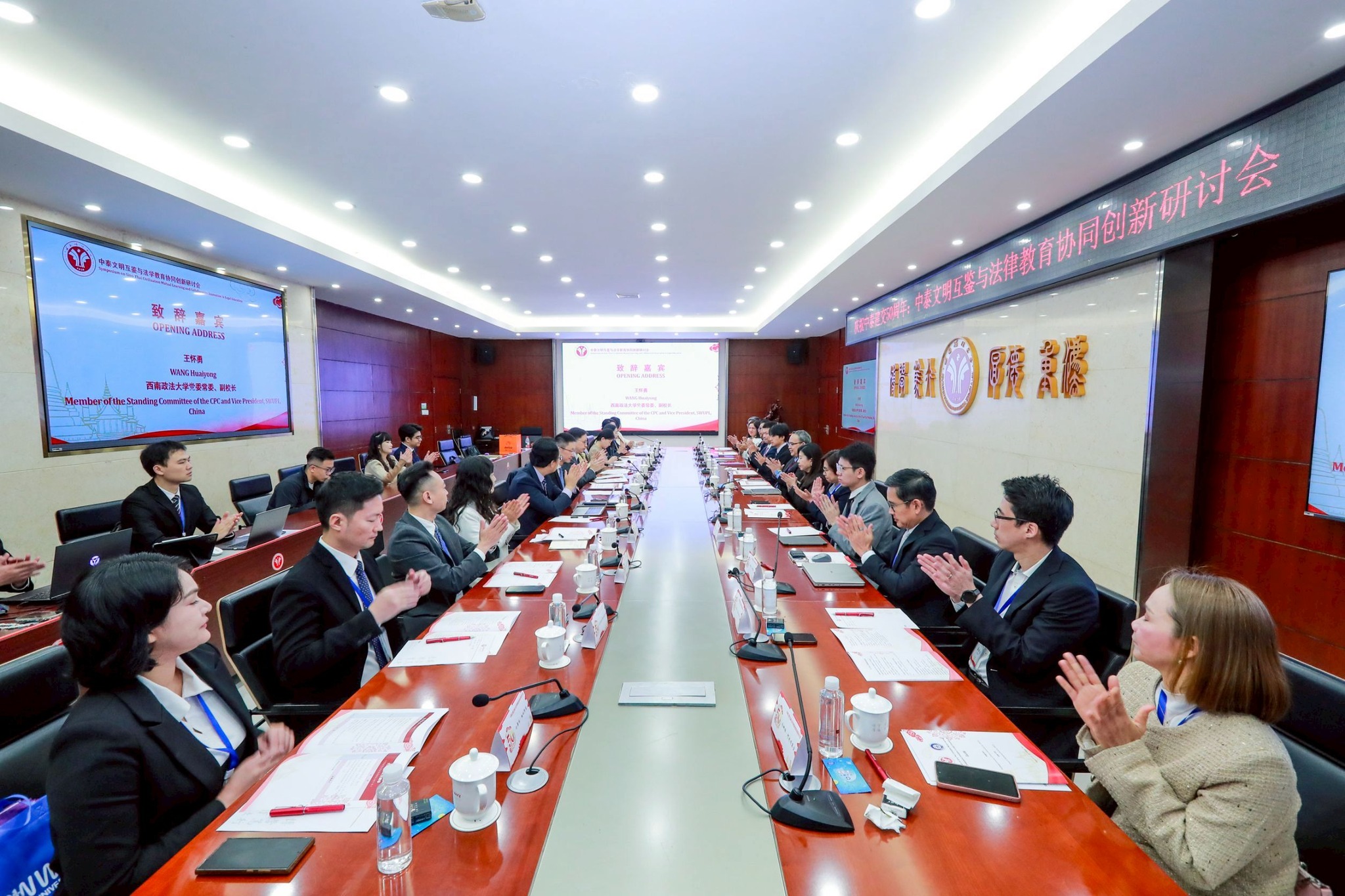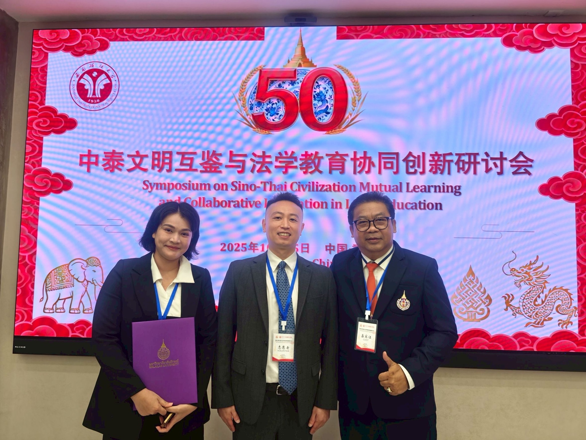 มื่อวันที่ 25 ตุลาคม 2568 ในโอกาสครบรอบ 50 ปี ความสัมพันธ์ทางการทูตระหว่างประเทศไทยและประเทศจีน คณะผู้แทนจากมหาวิทยาลัยวลัยลักษณ์ นำโดย รศ.นเรศร์ เกษะประกร รักษาการเเทนคณบดีสำนักวิชานิติศาสตร์ ดร.กรฐิมา พัฒนศิลป์ และอาจารย์กนกพล นิกรเพสย์ รักษาการแทนผู้ช่วยคณบดีฝ่ายกิจการต่างประเทศ ได้เข้าร่วมงาน “สัมมนาว่าด้วยการเรียนรู้ร่วมทางอารยธรรมไทย–จีนและความร่วมมือเชิงนวัตกรรมทางการศึกษากฎหมาย” จัดโดยมหาวิทยาลัย Southwest University of Political Science and Law (SWUPL) เมืองฉงชิ่ง สาธารณรัฐประชาชนจีน